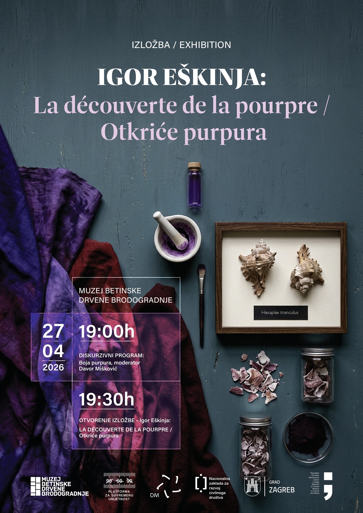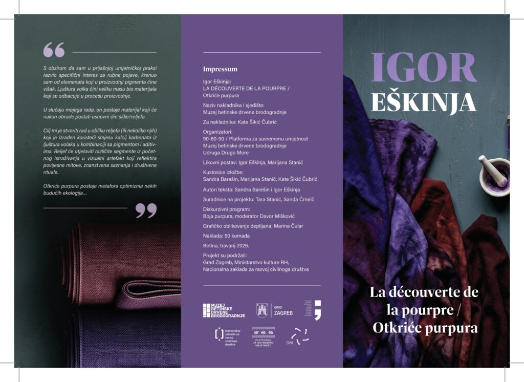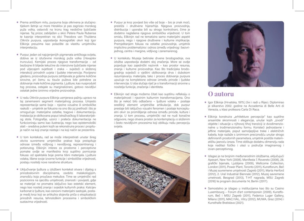 Muzej predstavlja projekt “Otkriće purpura” umjetnika Igor Eškinje, koji kroz suvremeni umjetnički pristup istražuje povijest, simboliku i materijalnost jedne od najcjenjenijih boja antičkog svijeta – purpura.