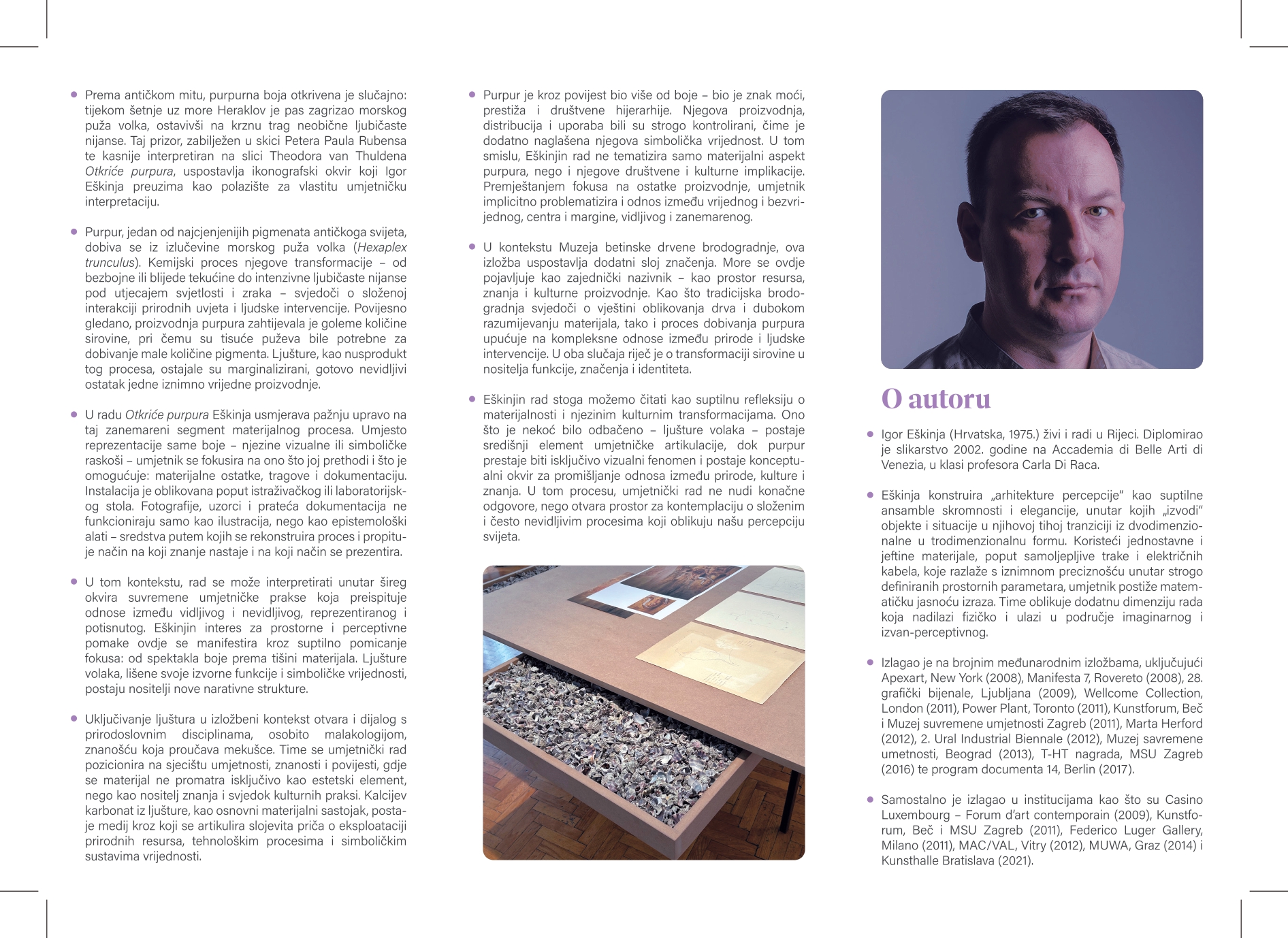 Prema antičkom mitu, purpurna je boja otkrivena slučajno, no u stvarnosti je njezina proizvodnja bila složen i dugotrajan proces koji je uključivao ekstrakciju pigmenta iz morskih puževa (volaka) i kemijsku transformaciju gotovo nevidljive tekućine u intenzivnu ljubičastu nijansu. Upravo taj proces – kao i njegovi zanemareni nusprodukti – nalazi se u središtu Eškinjinog interesa.